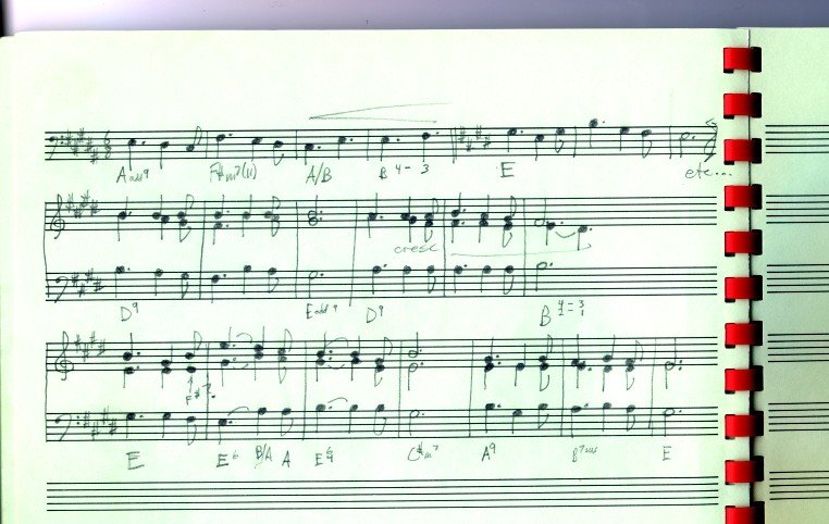 You can see that my hurried scribbles use a weird mixture of pop chord symbols (B7sus, A/B) and more classical notation (E6/4, B4-3). I got this new stuff into the computer and printed it out so I could add the accompaniment at the piano: