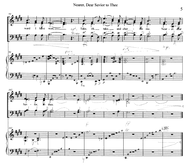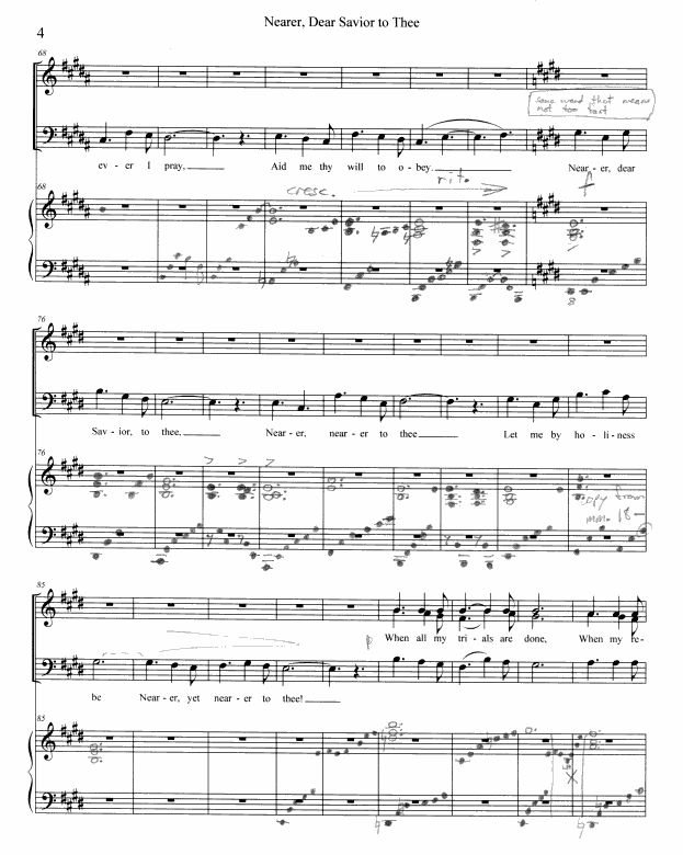 Have you ever wondered how a hymn arrangement is made? Well, I sure have! Of course, what I’d really like to see are the intermediate sketches from a project by John Rutter, Arvo Pärt, or Eric Whitacre, etc., but I don’t have any of those laying around the house. Instead I’ll share some of the work from my arrangement of “Nearer, Dear Savior to Thee” for SAB choir and piano.
