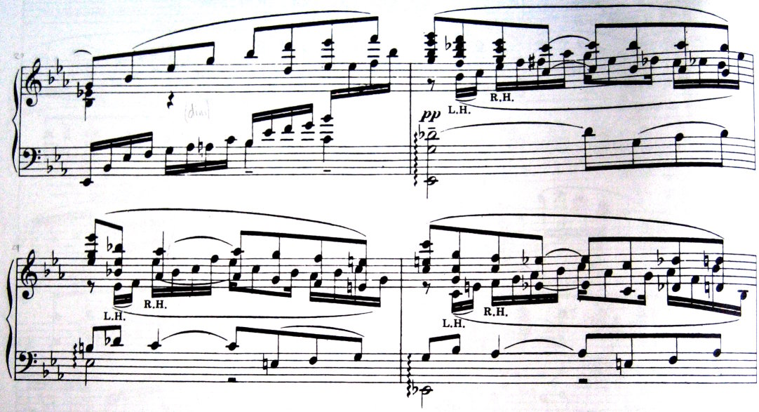 In transcribing this passage, I have attempted to do as few manual adjustments as possible, although the border between data entry and layout adjustment is fuzzy. I also omitted the “LH” and “RH” markings in both tests and I added a slur to the fourth measure where I believe the engraver may have omitted one. (The sequence suggests that the composer would have placed one there.) Here are the results (click images for PDFs):